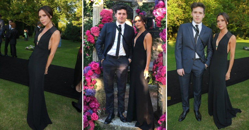 Викторија Бекам во црна креација и смарагден накит со синот Бруклин на галата на Елтон Џон