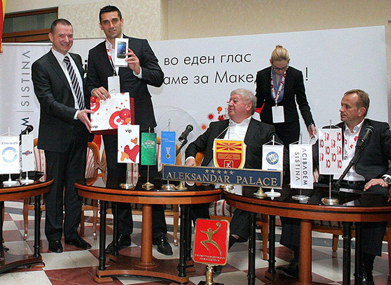 Капитенот Кире Лазаров го прима смартфонот Samsung Galaxy Nexus од Никола Љушев, главниот извршен директор на Вип