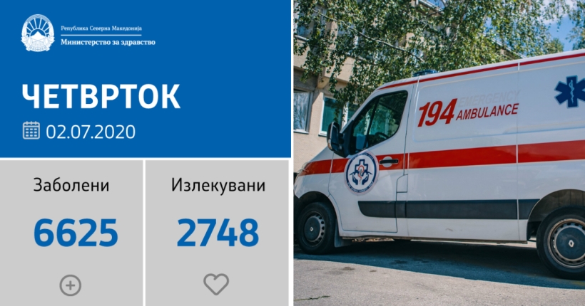 Вкупната бројка на дијагностицирани со КОВИД-19 во нашата земја од почетокот на епидемијата изнесува 6.625, бројката на оздравени пациенти е 2.748, на починати е 321, а во моментов бројот на активни случаи во земјата изнесува 3.556.
