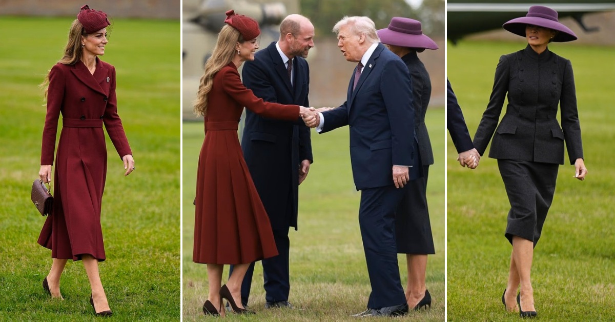 43-годишната принцеза им посака добредојде на Доналд и Меланија во префинет палто-фустан во бордо нијанса од британската дизајнерка Емилија Викстед, кој го комбинираше со капа од Џејн Тејлор вредна 2.330 фунти и шик чанта од Шанел во истата боја.
