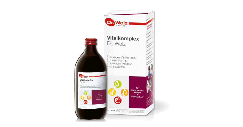 Vitalkomplex Dr. Wolz содржи особено квалитетна комбинација на разни функционални природни супстанции со докажано позитивно дејство. Vitalkomplex Dr. Wolz му обезбедува на организмот голема количина витамини, минерали и разни биоактивни растителни материи, како што се Б витамините, полифенолите антоцијанините, катехините и ликопенот, добиени од овошјето и зеленчукот. Темната боја на концентратот е карактеристика на овошјето и зеленчукот богати со сино-виолетовиот фенол. Vitalkomplex Dr. Wolz е богат додаток за оние кои се грижат за своето здравје, како и за возрасни и деца кои од разни причини не јадат доволно овошје и зеленчук.