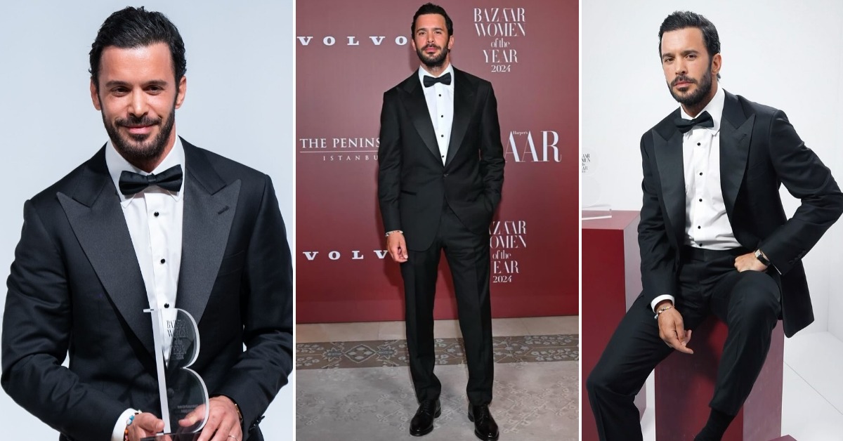 37-годишниот турски актер, кај нас познат по улогата на Омер во серијата „Вљубениот ерген“, мамеше погледи во елегантно издание во Истанбул. На свеченоста „Жени на годината“, тој се појави во класичен црн костум со бела кошула.