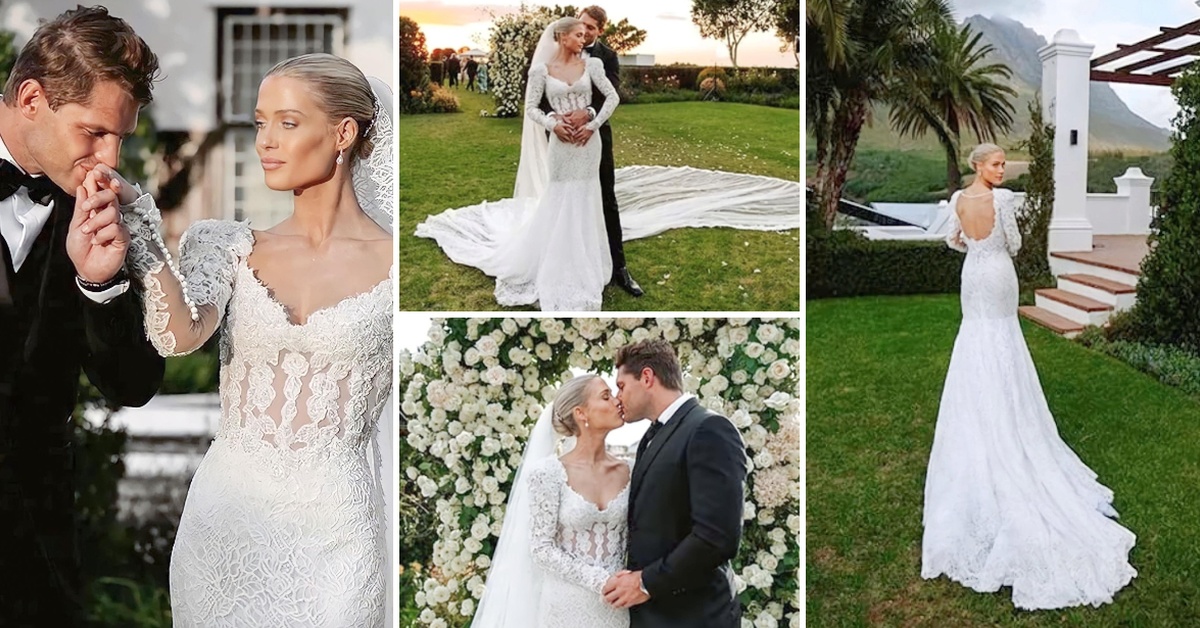 Среќната невеста блескаше во впечатлива венчаница од ателјето на Версаче. Креацијата со долги ракави е надополнета со чипкасти и цветни детали и украсена со сваровски кристали.