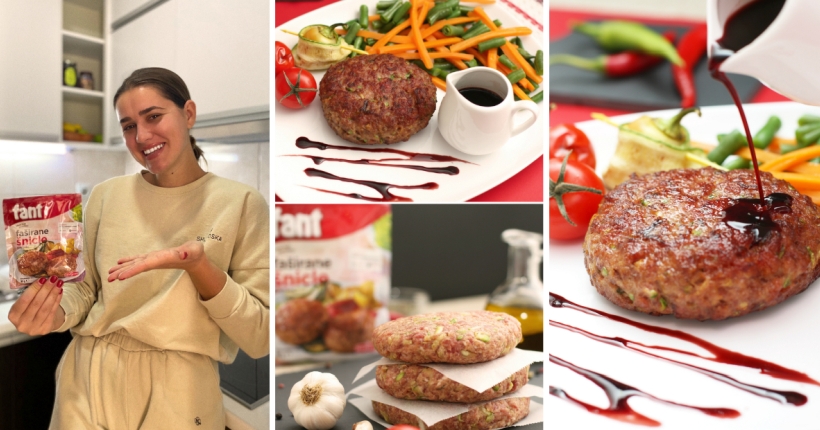 Содржината од ќесичката Fant ја ставаме да отстои неколку минути во 150 мл млака вода вода и ја мешаме со меленото месо, мајчината душичка и тиквичките. Оформуваме 4 плескавици.