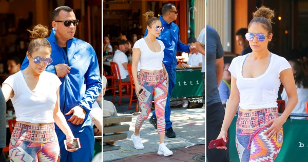 Славната актерка и пејачка беше фотографирана во лежерно издание со Алекс Родригез во Њујорк. На фотографиите, Џеј Ло носи колоритни хеланки од брендот Niyama SOL, бели патики од Addidas и огледални очила за сонце од Quay.