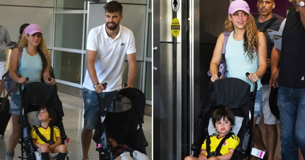 На фотографиите, Шакира го вози во количка тригодишниот Милан, додека познатиот спортист ја турка количката со заспаното едногодишно синче.