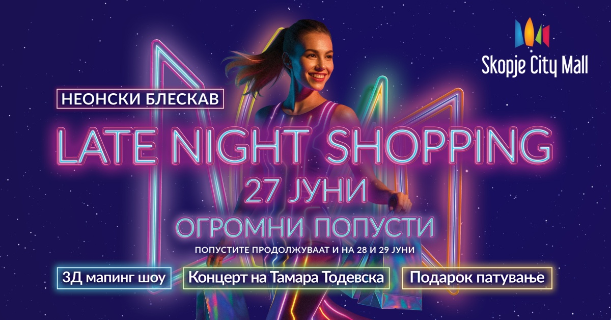 Традиционално, блескав почеток на летото со еден од највозбудливите шопинг настани во годината ‒ Late Night Shopping неонска едиција, со одлични попусти, многу подароци, а на главната сцена спектакуларна 3Д-проекција со балетски перформанс и концерт на Тамара Тодевска!