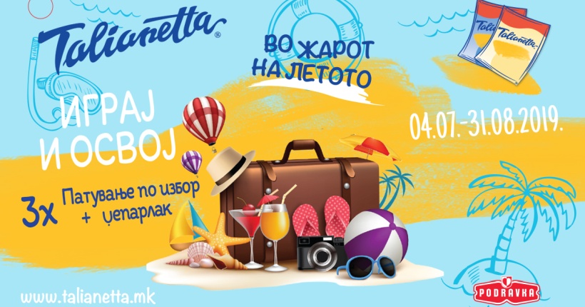 Кој е за лесно, вкусно и едноставно решение за 15-ина минути? Веруваме дека повеќе би сакале да побарате сенка или климатизирана просторија после напорниот работен ден отколку да трошите часови на готвење над шпорет. Готвењето препуштете ни го на нас! А исто така и патувањето! Во жарот на летото Талианета ве води на вашата омилена дестинација. Купете било кои 2 Талианета производи – рижото или тестенини, зачувајте ја фискалната сметка, испратете ја на www.talianetta.mk, пополнете го формуларот и очекувајте го вашето патување од соништата. Талианета доделува три патувањa по избор и џепарлак. Играј и добиј! Во жарот на летото со Талианета!