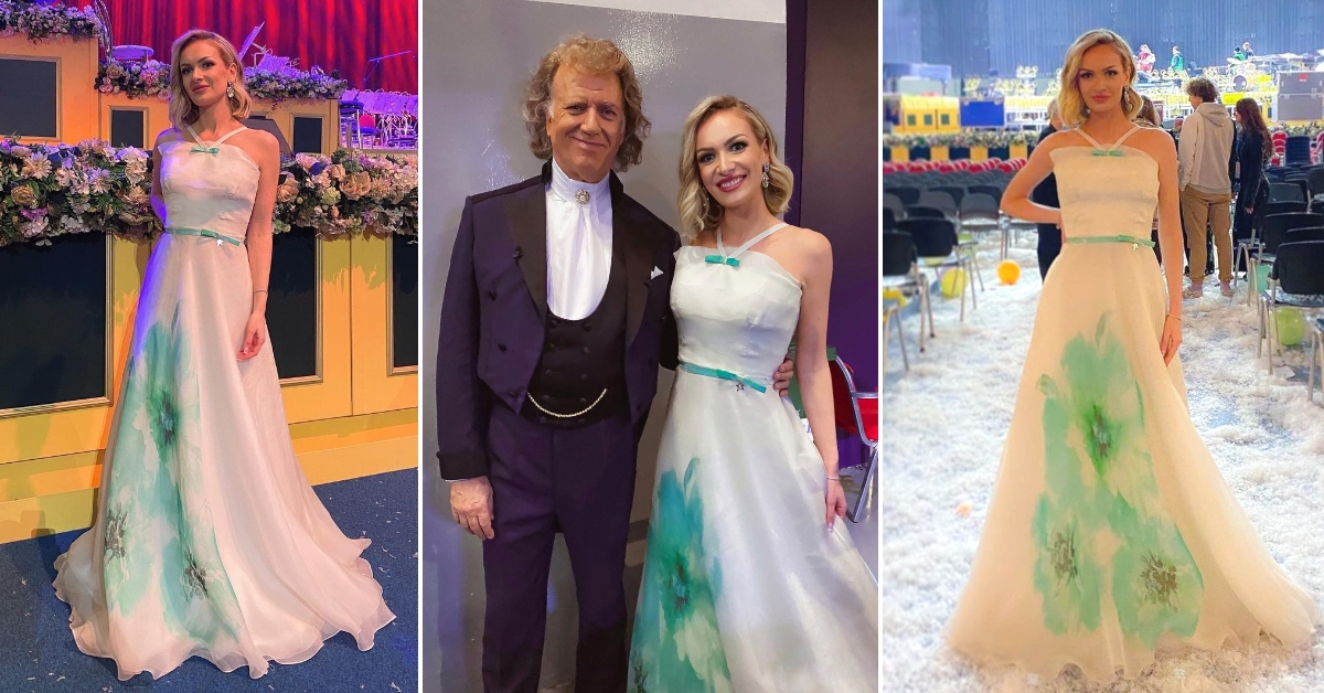 Убавата водителка ја имаше честа да ја дели сцената со „Кралот на валцерот“ и со неговиот оркестар. За музичкиот спектакл во салата „Борис Трајковски“, Јана избра романтична креација од ателјето на дизајнерката Антонија Ристовска.