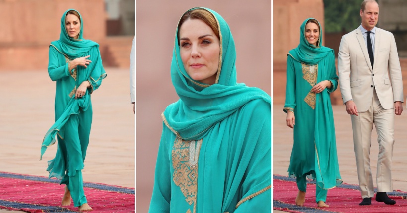 Кралскиот пар денес ја посети џамијата Бадшахи во Лахор. 37-годишната војвотка од Кембриџ носеше тиркизен шалвар-камиз и марама од Махин Кан.
