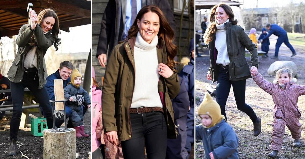40-годишната припадничка на британското кралско семејство беше во добро расположение за време на посетата на градинка во шума во Копенхаген. Кетрин беше облечена во јакна од Seeland, црни фармерки и чизми од Blundstone.