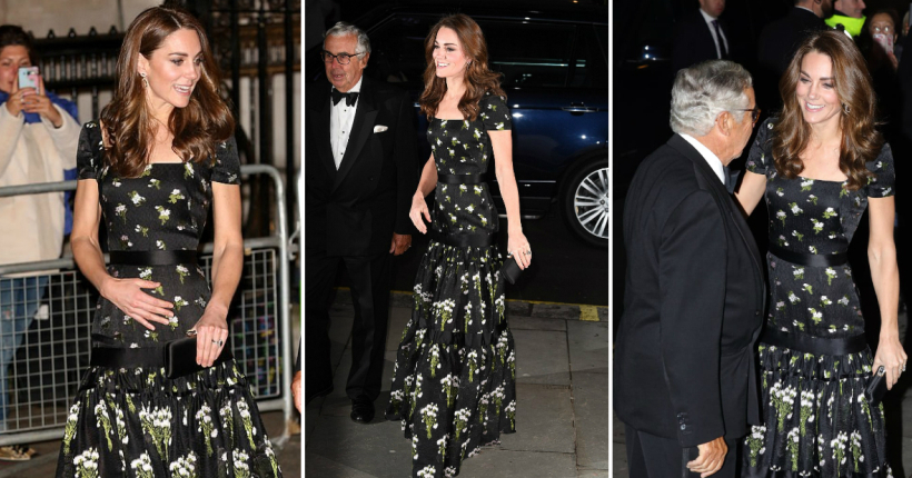 За добротворниот настан на кој присуствуваа голем број славни личности, 37-годишната сопруга на принцот Вилијам избра долг црн фустан со цветни детали од Александар МекКвин и салонки од Џими Чу.