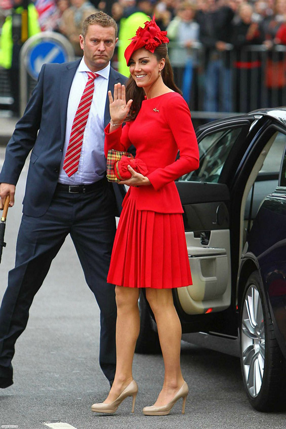 Војвотката КетринЦрвениот фустан со плисирано здолниште е од еден од омилените модни брендови на Кетрин, Александар МекКвин, и доаѓа од истата дизајнерка којашто го креираше нејзиниот невестински фустан, Сара Бартон.