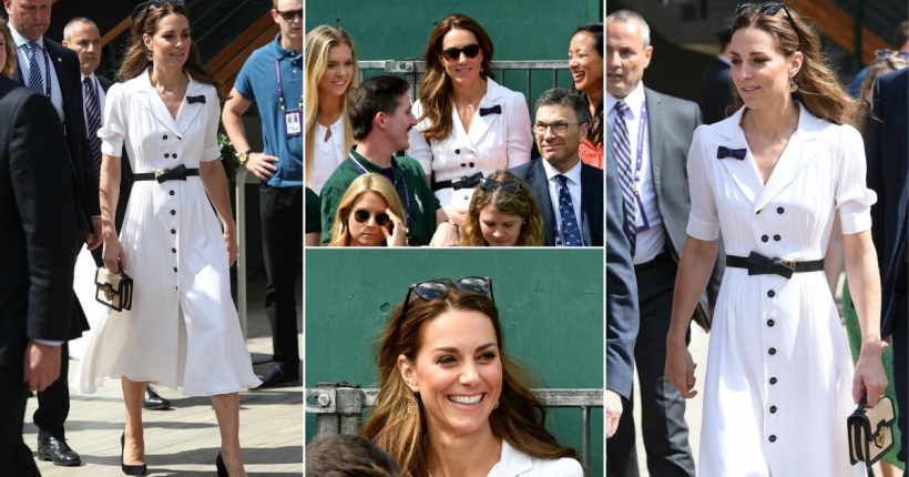 37-годишната припадничка на британското кралско семејство се појави на престижниот тениски турнир во бел кошула-фустан со колан од Александар МекКвин и чантичка од истиот бренд.