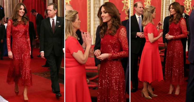 38-годишната Кетрин избра блескаво црвено издание. Фустанот од брендот Needle & Thread, таа го надополни со црвени салонки од Џанвито Роси и чантичка од една од нејзините омилени дизајнерки – Џени Пекам.