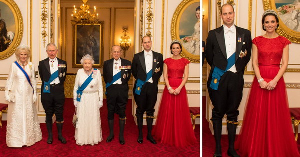 На дипломатскиот банкет, 34-годишната сопруга на принцот Вилијам блескаше во црвен фустан од Џени Пекам. Кралскиот изглед на Кетрин го надополнуваше прекрасната тијара „Cambridge Lover’s Knot“, која ѝ беше омилена на принцезата Дијана.