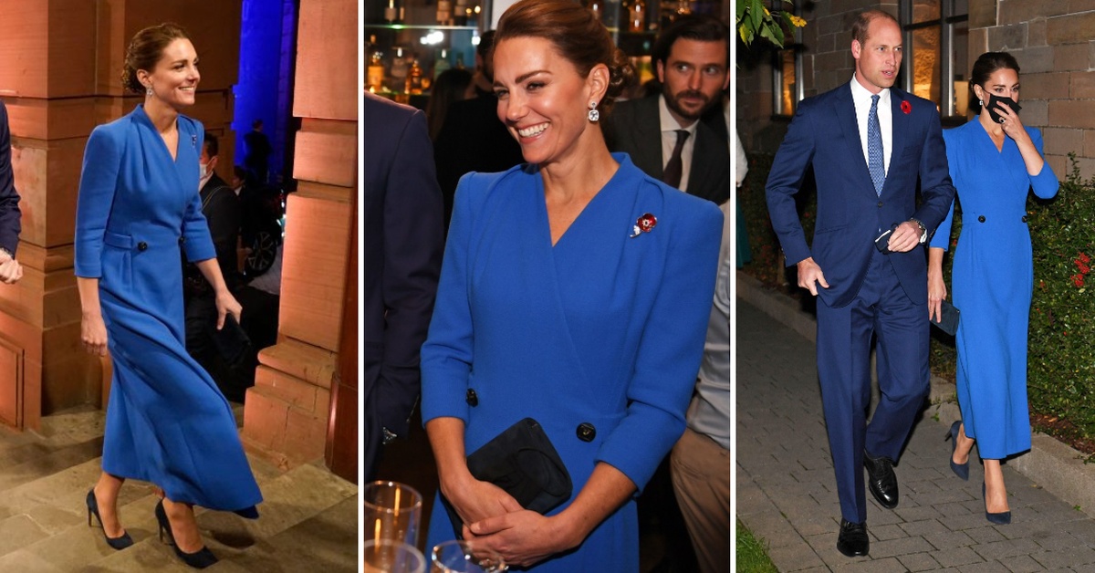 На вечерата, 39-годишната војвотка пристигна во фустан во кралска сина боја од Eponine. Својот моден избор, Кетрин го надополни со тегет салонки од Rupert Sanderson.