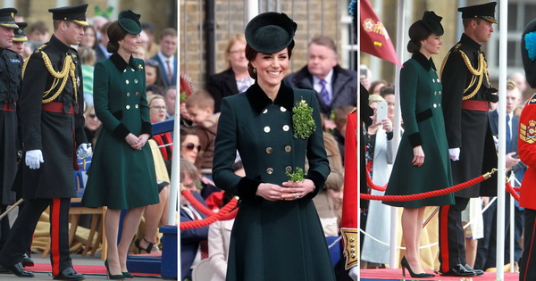 Во духот на празникот, 35-годишната припадничка на британското кралско семејство беше облечена во зелена боја. Отменото палто го носи потписот на Кетрин Вокер.
