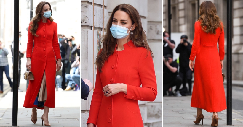 Нејзината елегантна комбинација вклучуваше палто во впечатлива црвена боја од брендот Eponine London, салонки во кафеава нијанса и чантичка од DeMellier.