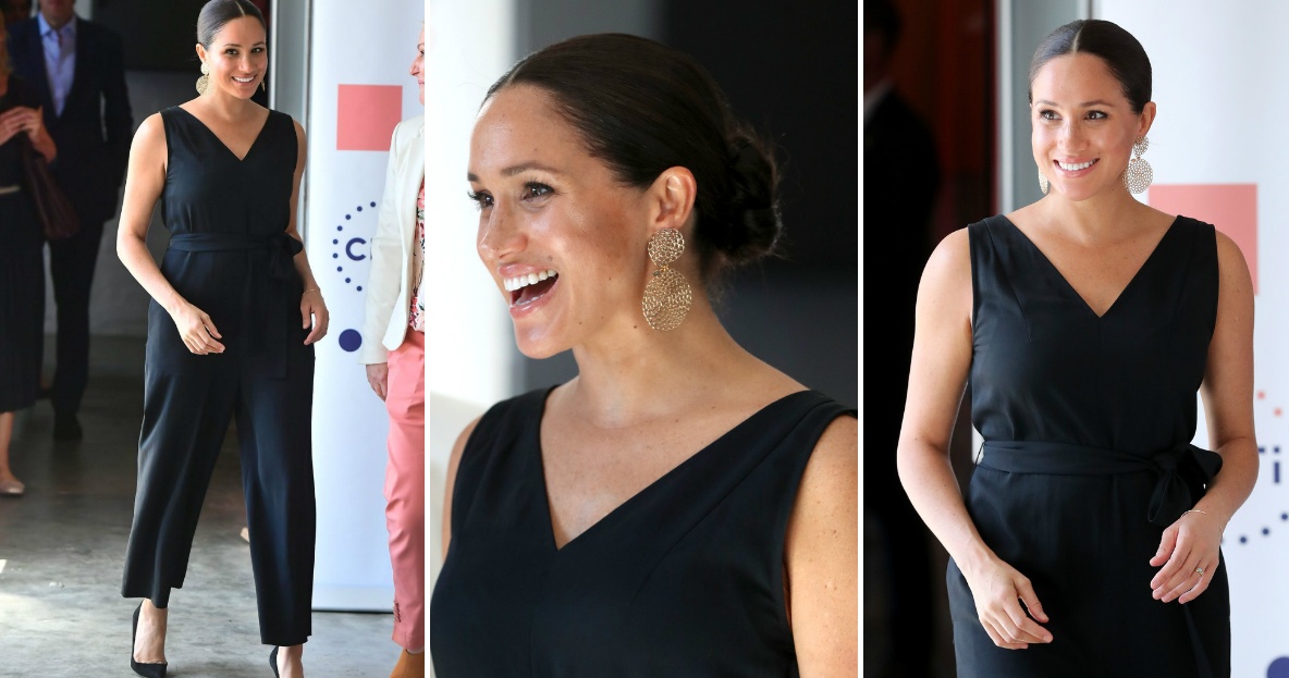 38-годишната припадничка на британското кралско семејство носеше елегантен црн комбинезон од брендот Everlane, кој чини 120 долари. За да внесе динамика во својот стајлинг, Меган избра впечатливи обетки од GAS Bijoux. Нејзиниот изглед вклучуваше и салонки од Маноло Бланик.