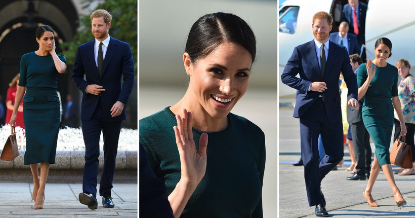 Кралскиот пар со приватен авион пристигна во Даблин. 36-годишната поранешна актерка со широка насмевка излезе во авионот, облечена во темнозелени креации од модната куќа Живанши.