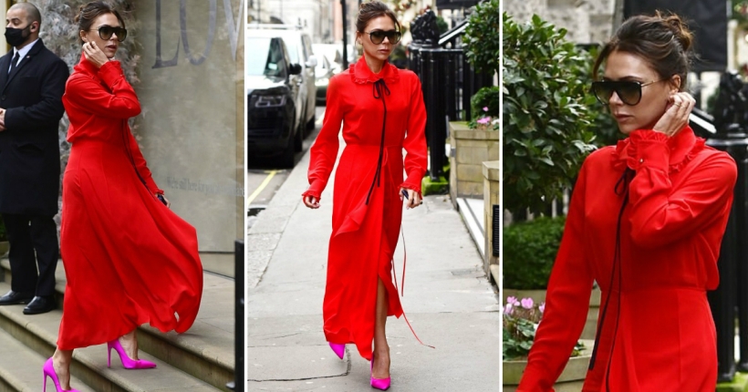 Како и обично, славната сопруга на Дејвид Бекам носеше сопствени креации. Црвениот фустан, кој е дел од нејзината колекција за пролет/лето 2021 и чини 1.690 евра, таа го надополни со розови обувки на штикла.