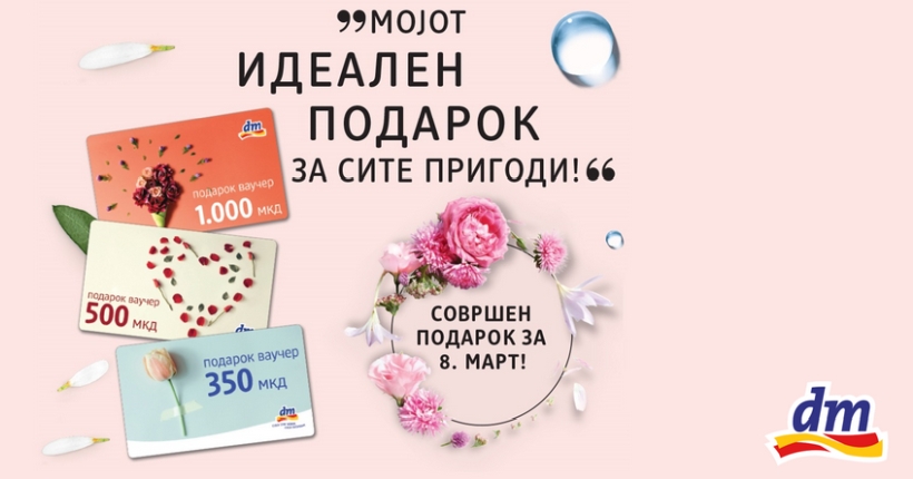 Благодарение на неговата удобност, насекаде во светот ваквиот вид на дарување е многу проширен и популарен, а благодарение на мотивите, вредносните ваучери од dm совршено се вклопуваат како подарок за секоја пригода. Ваучерите може да се набават во сите dm дрогерии во вредност од 350, 500 и 1.000 мкд.