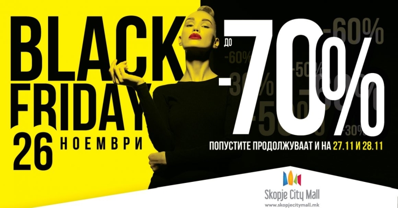 Скопје Сити Мол реши оваа година даго врати познатиот концепт во интернационалната кампања Black Friday која ја прави веќе традиционално 7та година. Од 26ти ноември (петок) во Skopje City Mall започнува нашето ТРИДНЕВНО Black Friday шопинг лудилото! Skopje City Mall нека биде местото кое сите вие љубителите на шопингот сигурно нема да го одминете. Од 10:00 часот продавниците на трговскиот центар ќе обезбедат специјални попусти за сите купувачи во рамките на акцијата Black Friday.