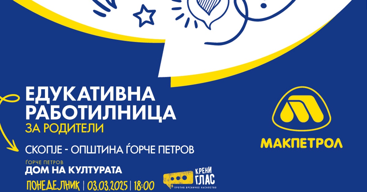 Десеттата работилница за родители во рамки на општествено одговорната кампања на „Макпетрол“ ќе се одржи утре (3 март) во Ѓорче Петров. Едукативната средба, што е дел од „Крени глас против врсничко насилство“, ќе се одвива во Домот на културата на општината, а нејзиниот почеток е закажан за 18 часот. Различните форми на булинг, како тие да се препознаат и начините за соодветно постапување ќе бидат дел од дискусиите на овој настан. Темата од стручен агол ќе биде обработена од психологот Деспина Стојановска, а работилницата ќе ја води актерот Сашко Коцев.