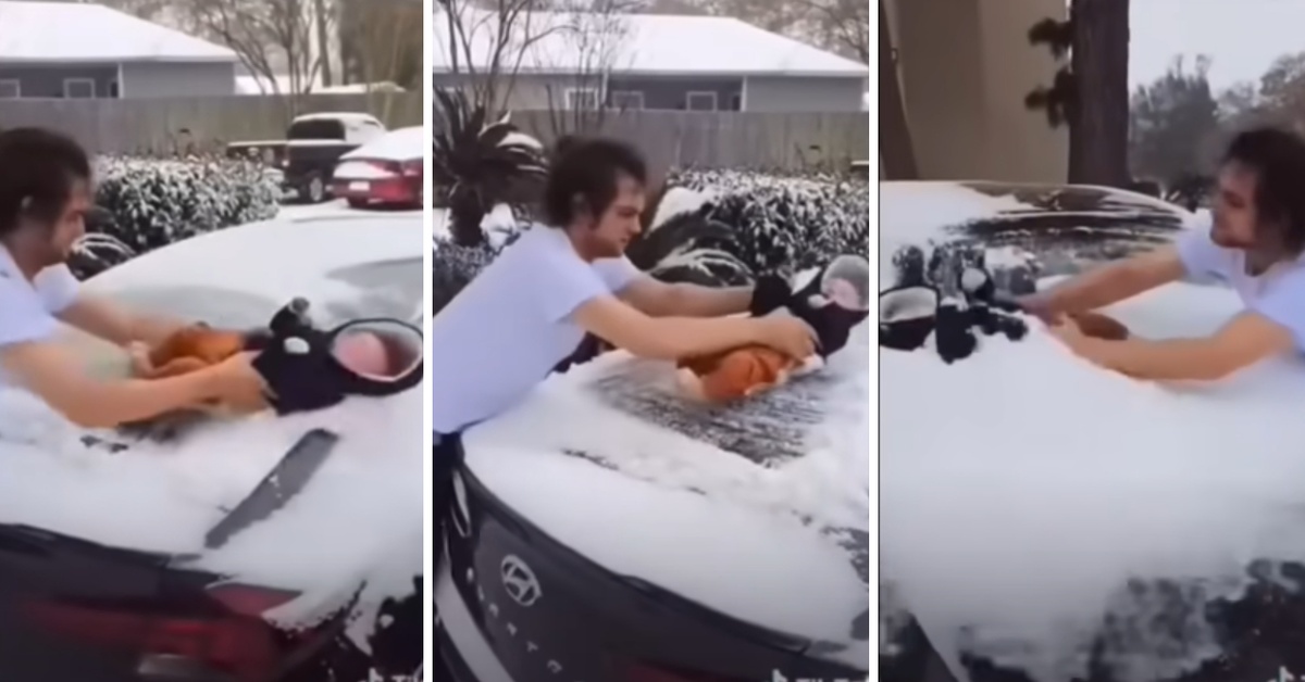 Во него, татко од Тексас го чисти снегот од автомобилот користејќи го своето тримесечно бебенце. 26-годишниот маж бил уапсен и моментално се води истрага за овој инцидент.