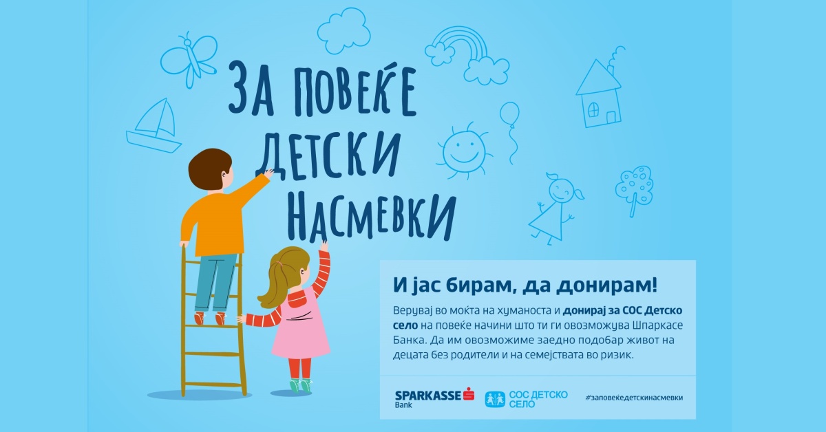 По повод – Светскиот ден на хуманоста, Шпаркасе Банка ја најавува новата соработка со својот долгогодишен партнер – СОС Детско село и заедничката кампања под мотото „За повеќе детски насмевки“, која ја пренесува силната порака за моќта на поврзувањето и градењето силни врски на доверба и поддршка, кои му се потребни на секое дете за да прерасне во силна индивидуа.