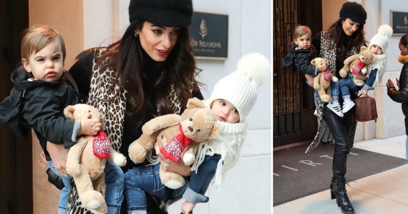 40-годишната правничка и активистка беше фотографирана со едногодишните близнаци Ела и Александар. Облечена во кежуал комбинација со елек со леопардски принт, Амал ги носеше дечињата од хотелот до нивниот автомобил.