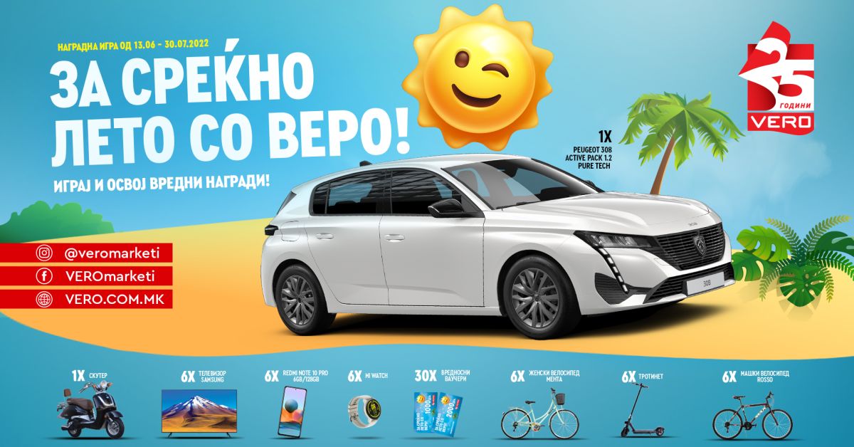 „За среќно лето со Веро“ е големата наградна игра со многу вредни награди за потрошувачите со која Веро го одбележува својот роденденски јубилеј и во која најсреќниот ќе си замине дома со автомобил Peugeot 308.
