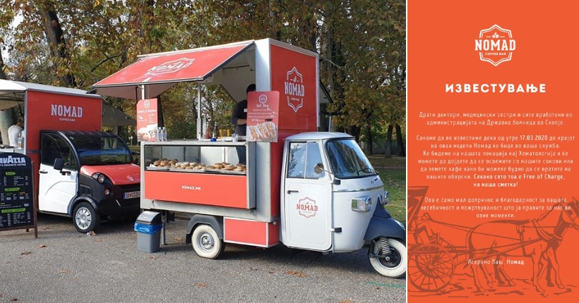 Кафе барот „Номад“ направи потег кој треба да го следат сите, нудејќи им на докторите, медицинските сестри и сите вработени во Државната болница во Скопје бесплатни пијалаци за да се освежат.