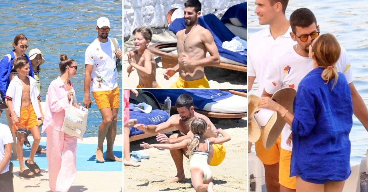 На популарниот грчки остров, 38-годишниот српски тенисер беше „уловен“ од папараците додека трчаше, играше и се забавуваше со синот Стефан и ќерката Тара, а нежно ја бакнуваше и својата сакана Јелена. Ноле и Стефан носеа складни костими за капење.