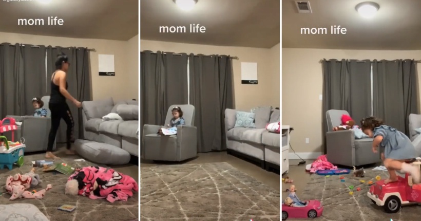 Во краткото TikTok видео, Габи ја средува дневната соба, собирајќи ги сите играчки и исфрлени работи, а само што ќе се заврти за секунда, целиот хаос е повторно вратен.
