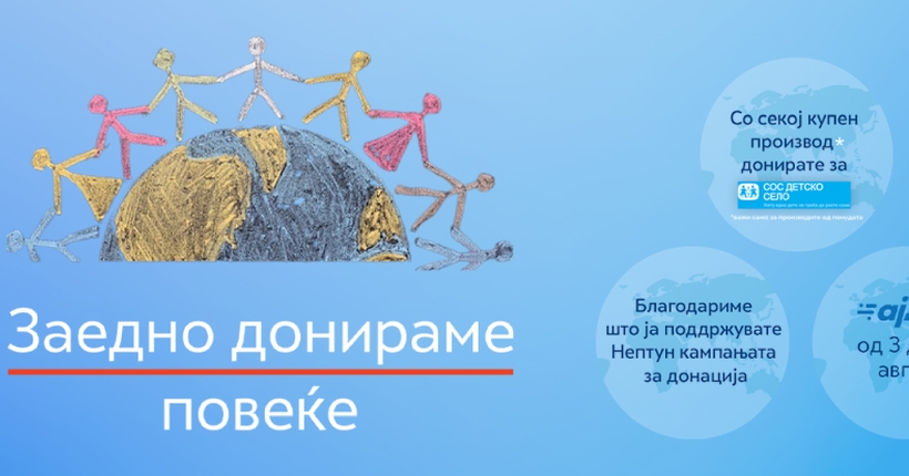03.08.2021 Скопје – Во рамките на воспоставената стратешка соработка помеѓу Нептун Македонија ДОО и СОС Детско Село, од 3ти до 19ти август, започнува Нептун кампања “Заедно донираме повеќе”. Со секој купен производ кој е дел од компаниската промоција, купувачите во Нептун имаат можност да се вклучат во донаторска акција.