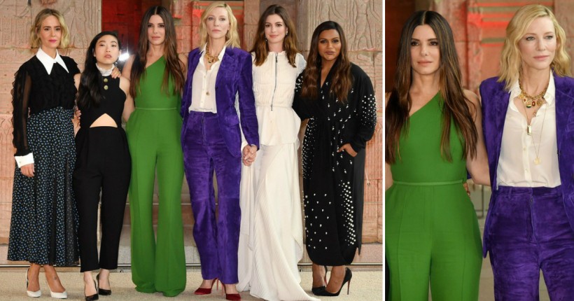 Женската банда од „Ocean's 8“: Сандра Булок во зелен комбинезон од Ели Сааб, Кејт Бланшет во виолетов костум...