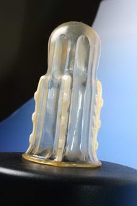 Д-р Елерс држи во рацете примерок на женски кондом Rape-aXe