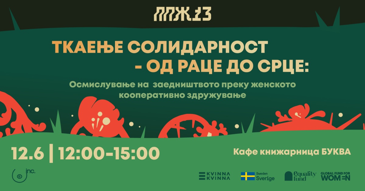 На 12 јуни (четврток), со почеток во 12:00 часот во кафе-книжарницата Буква во Скопје, ќе се одржи дебата и промоција на публикацијата „Ткаење солидарност – од раце до срце: осмислување на заедништвото преку женското кооперативно здружување“. Настанот е дел од програмата на фестивалот за феминистичка акција и култура ПРВО ПА ЖЕНСКО #13, кој оваа година тематски се фокусира на заедничкото дејствување, алтернативните економии и феминистичките одговори на системската нееднаквост.