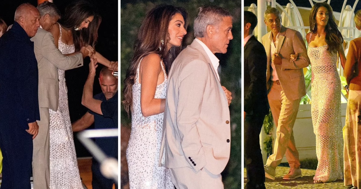 46-годишната адвокатка носеше свечен долг фустан, додека Клуни носеше бежов костум.