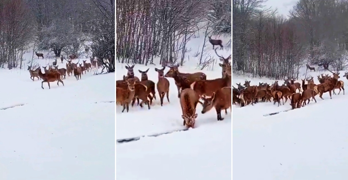 Од Националниот парк објавија снимка на која се гледа како стадото европски елени се движи низ снегот на планината.