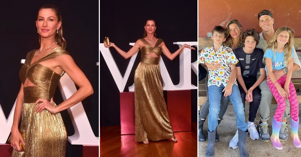 42-годишниот супермодел ја истакна одличната фигура во златна креација на свечена вечера во Сао Паоло, Бразил. Во својата татковина, Жизел пристигна со