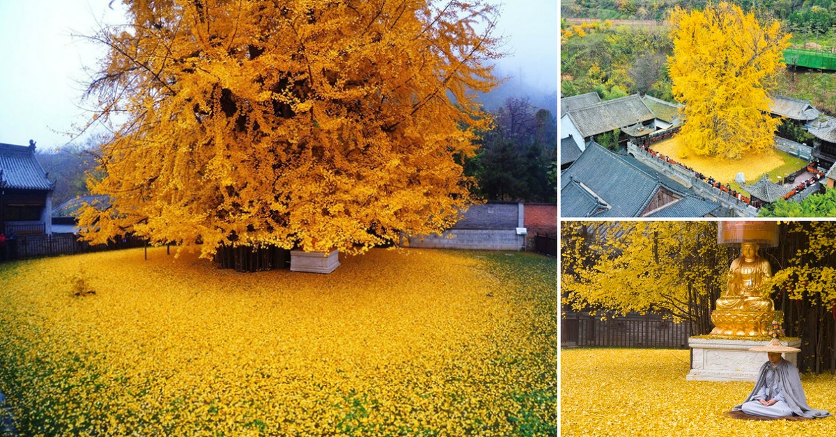 Моќта на природата често нè восхитува. Гинко дрво старо 1.400 години секоја есен создава прекрасна златна прекривка од испаднатите светложолти лисја.