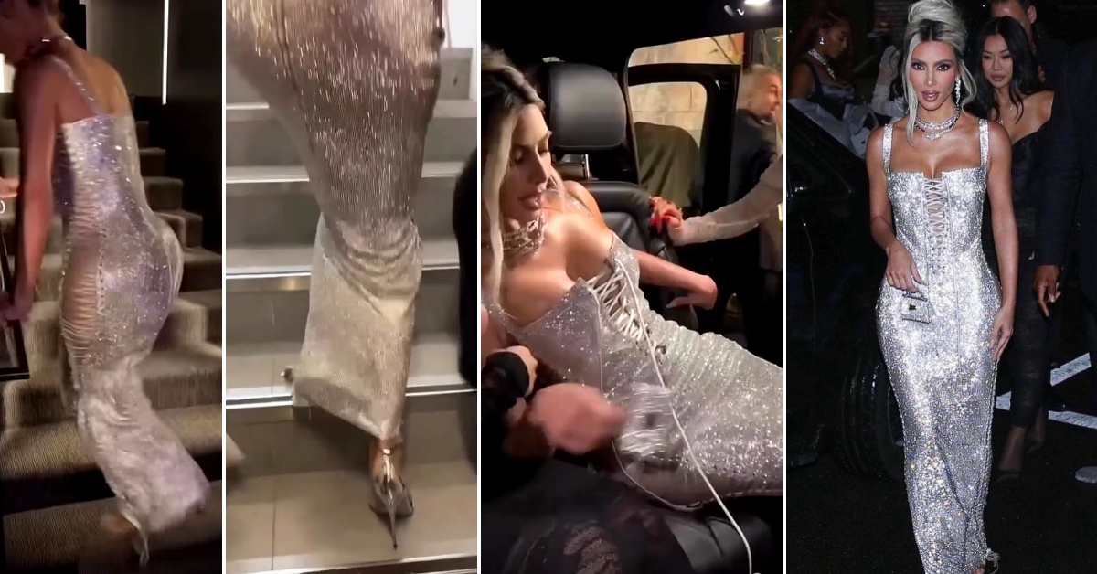 41-годишната ѕвезда од „The Kardashians“ на TikTok сподели хумористично видео од забавата на Долче и Габана во рамките на Миланската модна недела. Во него се гледа дека таа е принудена да скока за да се качи по скали поради нејзиниот претесен фустан од италијанскиот моден бренд. Подоцна, Кардашијан наоѓа друг начин за качување по скалите – правејќи минијатурни чекори.